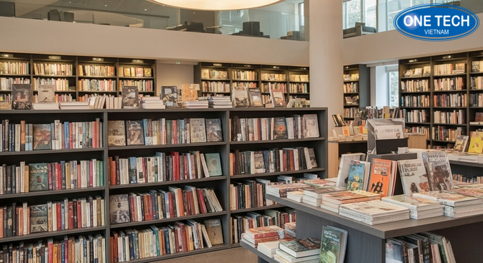- Giữa nhà sách: dùng kệ để sách báo hai mặt để tạo tuyến tham quan rõ ràng.