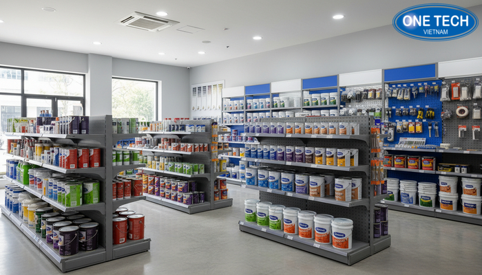 OneTech Kệ siêu thị An Giang tư vấn và lắp đặt kệ trưng bày sơn nước
